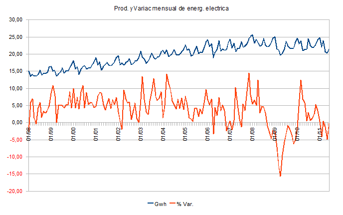 En lo que llevamos de año se ha generado un 1,30 % menos de energía eléctrica que en 2010 y la escusa que se pone es que el año pasado hizo más frío, y nos cuentan que corregido el efecto de la climatología y de la laboralidad en realidad estamos creciendo un 0,40 %. Y eso que estamos exportando más energía que el año pasado a Marruecos, Portugal y Francia, porque si no se tuviera esto en cuenta la situación todavía sería peor.