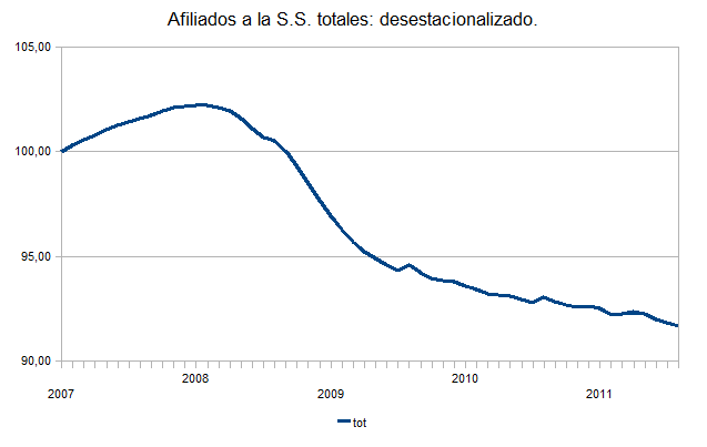 Las siguientes gráficas muestran la evolución del número de afiliados a la Seguridad Social desde Enero de 2007 hasta el mes de julio de este año. Son datos desestacionalizados y están representados tomando como base 100 el dato de enero de 2007, así se puede ver más fácilmente la variación en porcentaje.