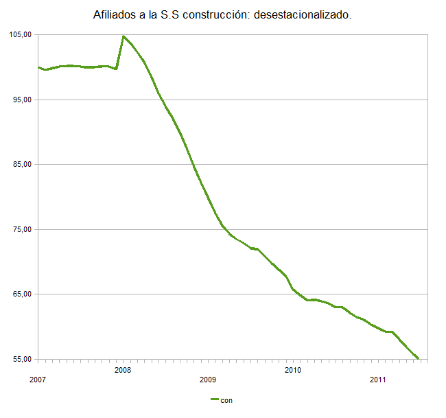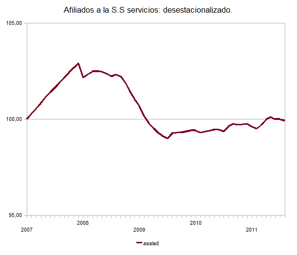 Como pueden ver, aunque ya se yan perdido el 45 % de los afiliados, ni siquiera se vislumbra lo que pudiera ser un cambio de tendencia en la destrucción de empleo. Hasta ahora los servicios se han encargado de ralentizar la tendencia bajista, pero ahora, con todos los ajustes presupuestarios, este es el sector que va a sumar al de la construcción. Por desgracia aún no podemos decir que lo peor ha pasado y no se crean lo que les cuenten los políticos.