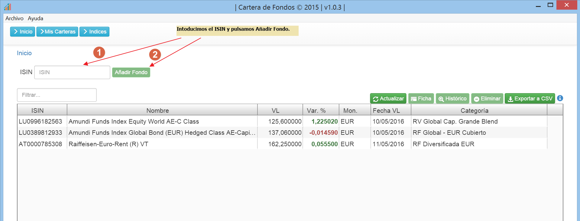 Una vez que tenemos los ISIN, nos vamos a la aplicación y en la pantalla inicial (listado de fondos) introducimos cada ISIN y vamos pulsamos el botón "Añadir Fondo".