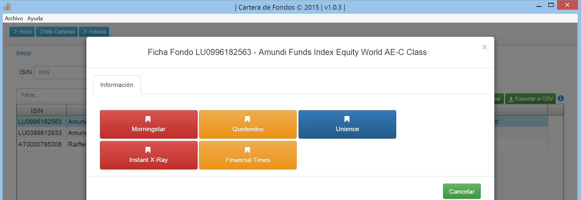 - Pulsando el botón Ficha tenemos acceso a las fichas de los fondos en las webs de información sobre fondos más relevantes, así como realizar un Instant X-Ray del fondo.