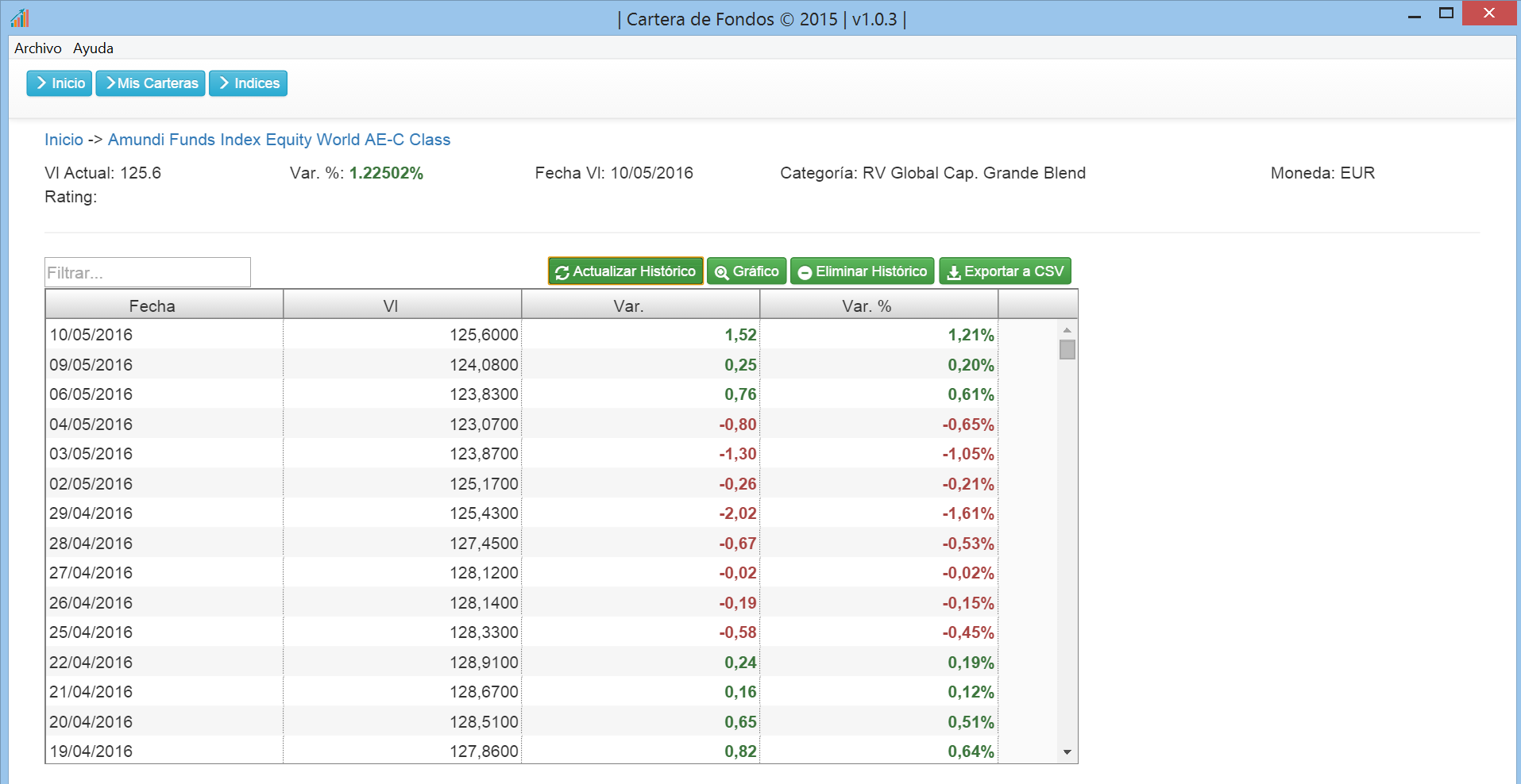 El botón "Actualizar" es muy importante, sirve para actualizar los valores liquidativos de los fondos, se actualiza a demanda cada vez que pulsamos este botón. También va tomando fotos de la cartera para luego mostrar los históricos.