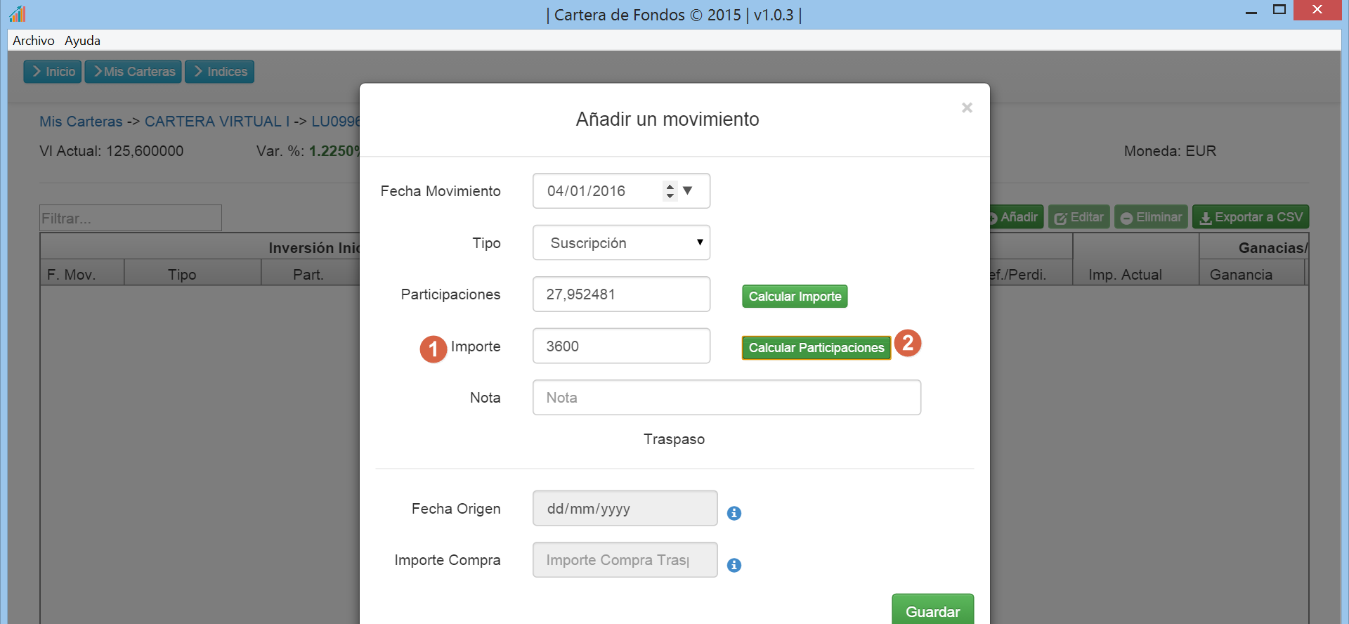 La fecha de Suscripción que habíamos supuesto era 04/01/2016. Como vamos a introducir el importe de la suscripción, queremos que la aplicación nos calcule directamente las participaciones que a esa fecha compramos con ese importe, para ello introducimos el importe y pulsamos "Calcular Participaciones". La aplicación nos calcula automáticamente las participaciones que a esa fecha compramos con ese importe.