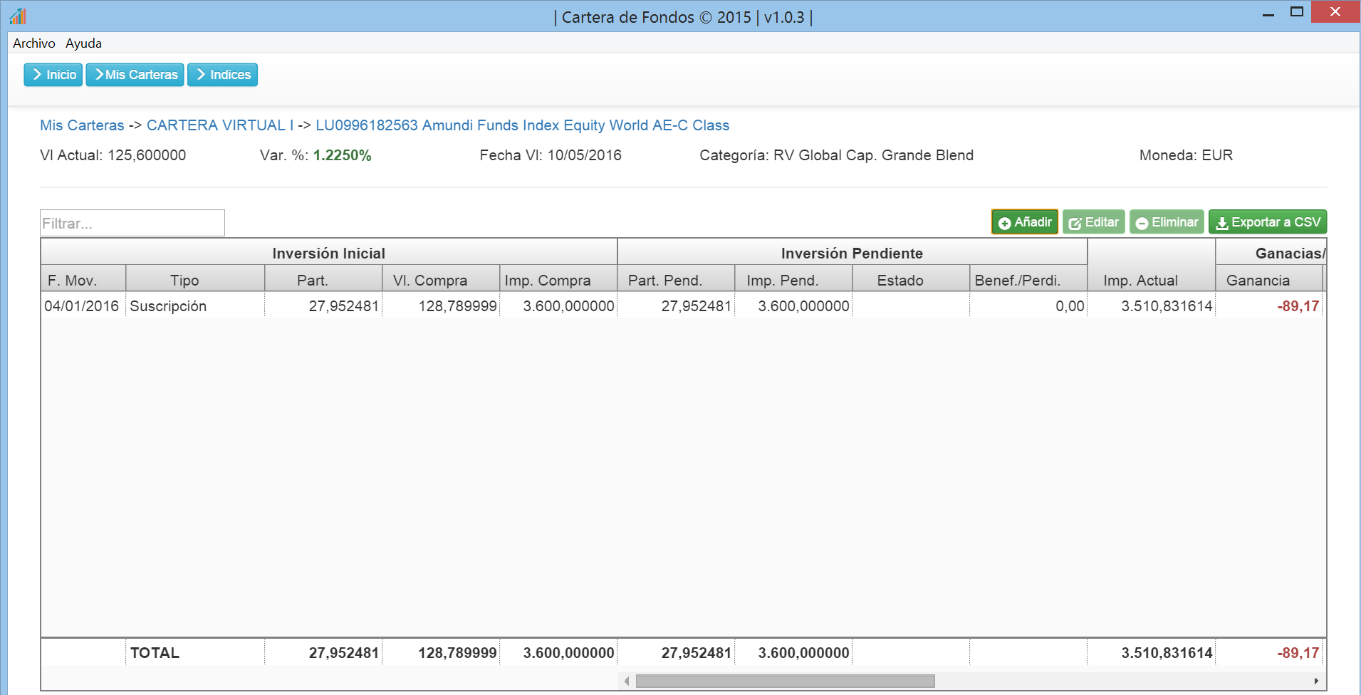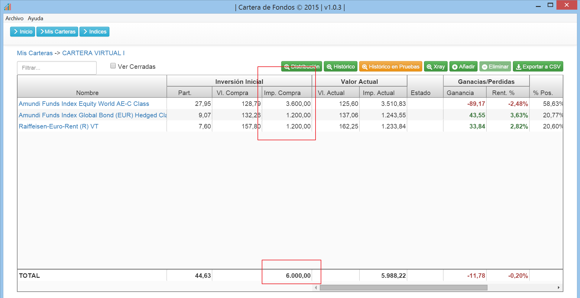 Repetimos el proceso por cada uno de nuestros fondos generándoles los movimientos propuestos. Nuestra cartera una vez configurada quedaría como la siguiente imagen.