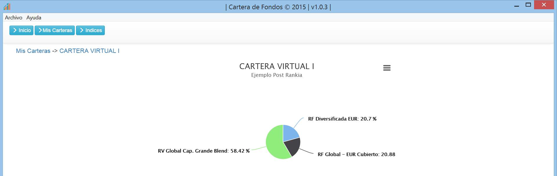 Partimos de una cartera sencilla, la cual hemos confeccionado con sus porcentajes en los distintos fondos (RV/RF).
