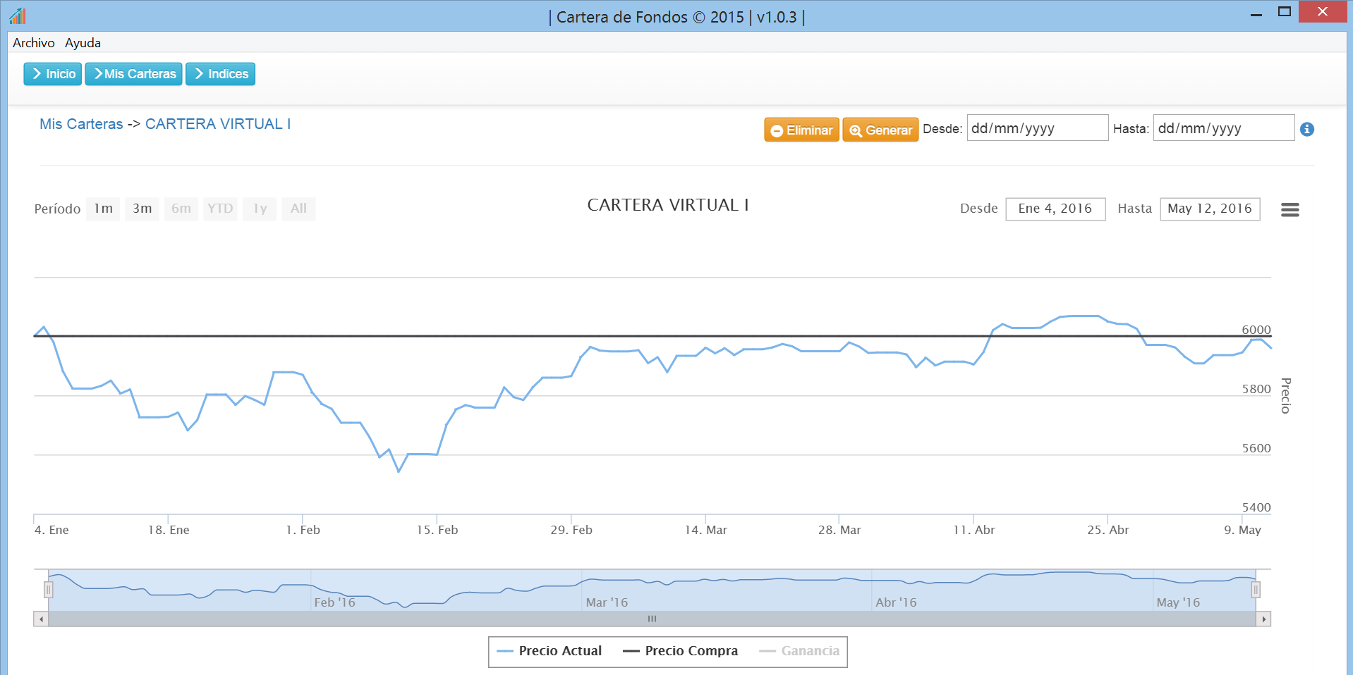 - Histórico - Histórico en pruebas: permite regenerar el histórico de la cartera completo y consultarlo, entre un rango de fechas o un determinado día. (Precio de Compra, Precio Actual y Ganancia). Nos permite ver la evolución de nuestra cartera de una forma visual. Es útil para identificar el comportamiento de nuestra cartera en épocas de bajadas así como su recuperación.