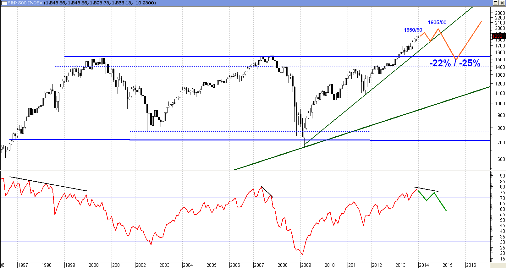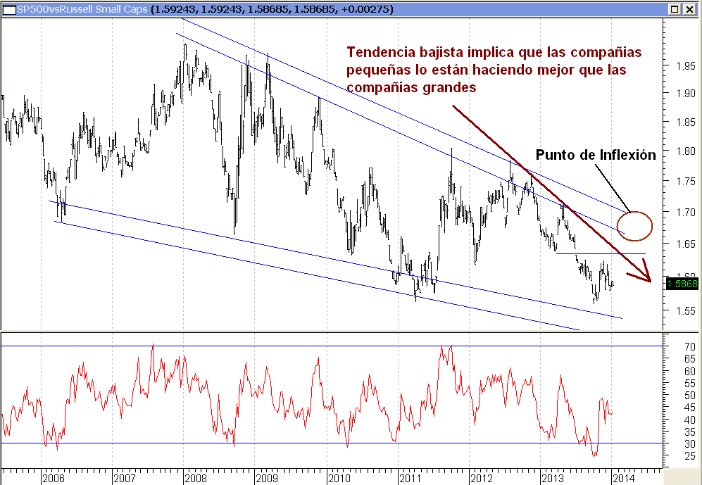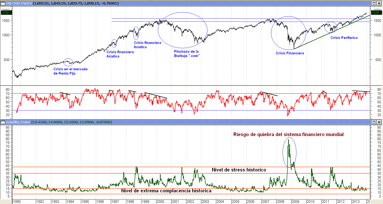 Lo normal es que un oscilador, en nuestro caso el RSI (Relative Strenght Index o Índice de Fuerza Relativa) tenga un comportamiento igual al del precio (en nuestro ejemplo el SP500). Es decir, que si el SP500 está haciendo máximo tras máximo, el RSI debe hacer lo mismo. Y si no ocurre decimos que ha surgido una divergencia bajista. Se trata de una señal de alerta importante. Me dice que algo no va bien, que tal vez el movimiento al alza no es tan sólido como parece, y que podemos estar cerca de comenzar un proceso correctivo importante. Este tipo de señal es especialmente relevante si se da en zonas de sobrecompra extrema. Como se aprecia en el gráfico, el RSI pintado con una línea roja, marco divergencias previas (pintadas en negro) a cada una de las fases bajistas que han tenido lugar en las últimas dos décadas. Lo cierto es que ahora también tenemos dicha señal activa. Lo cual se añade al argumento cíclico de 7 años entre máximos que incita a pensar en que 2014 puede traernos sorpresas bajistas importantes.