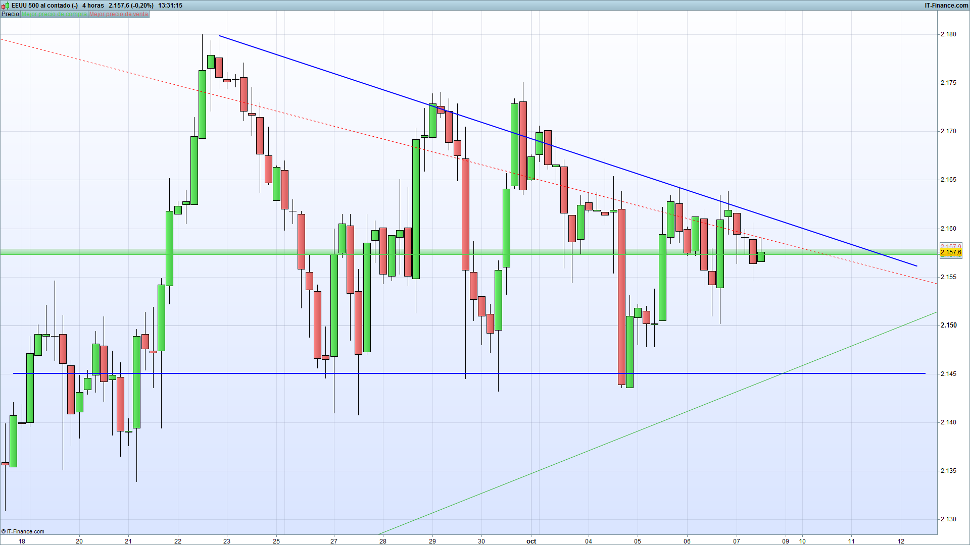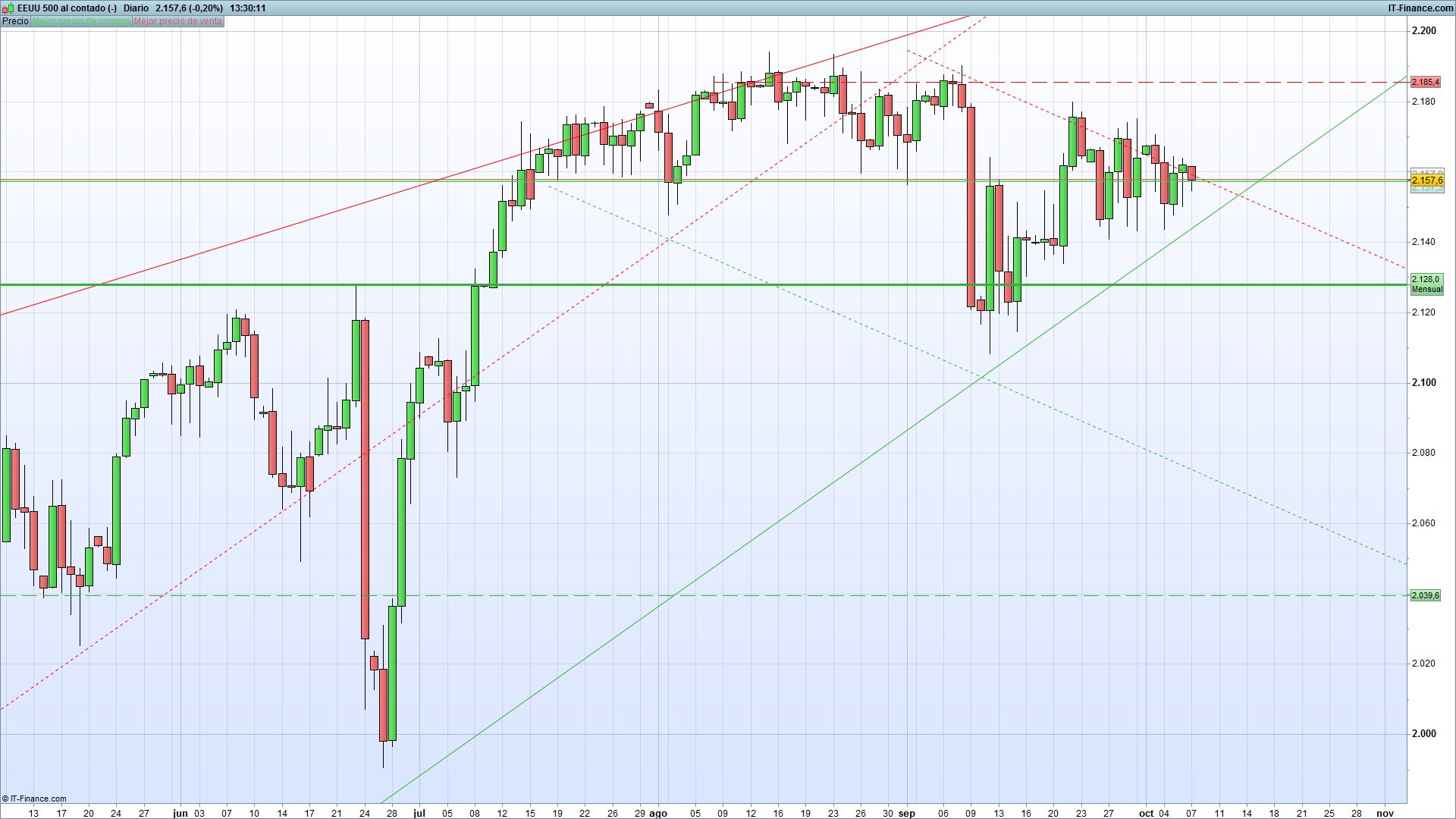 El índice de referencia SP 500, cotiza en el momento de escribir este reporte a 2157.4 dólares. No se ha hecho esperar la reacción de la noticia más relevante del mes, la tasa de desempleo de los EEUU, este dato ha arrojado un resultado negativo, por lo que entendemos que el paro ha aumentado debilitando de esta manera la divisa estadounidense. El primer movimiento ha sido alcista correspondiente al dato de la noticia con un movimiento de un 0.53%, sin embargo, poco después se ha fortaleciéndose un 0.69%, un movimiento totalmente contradictorio al resultado económico.
