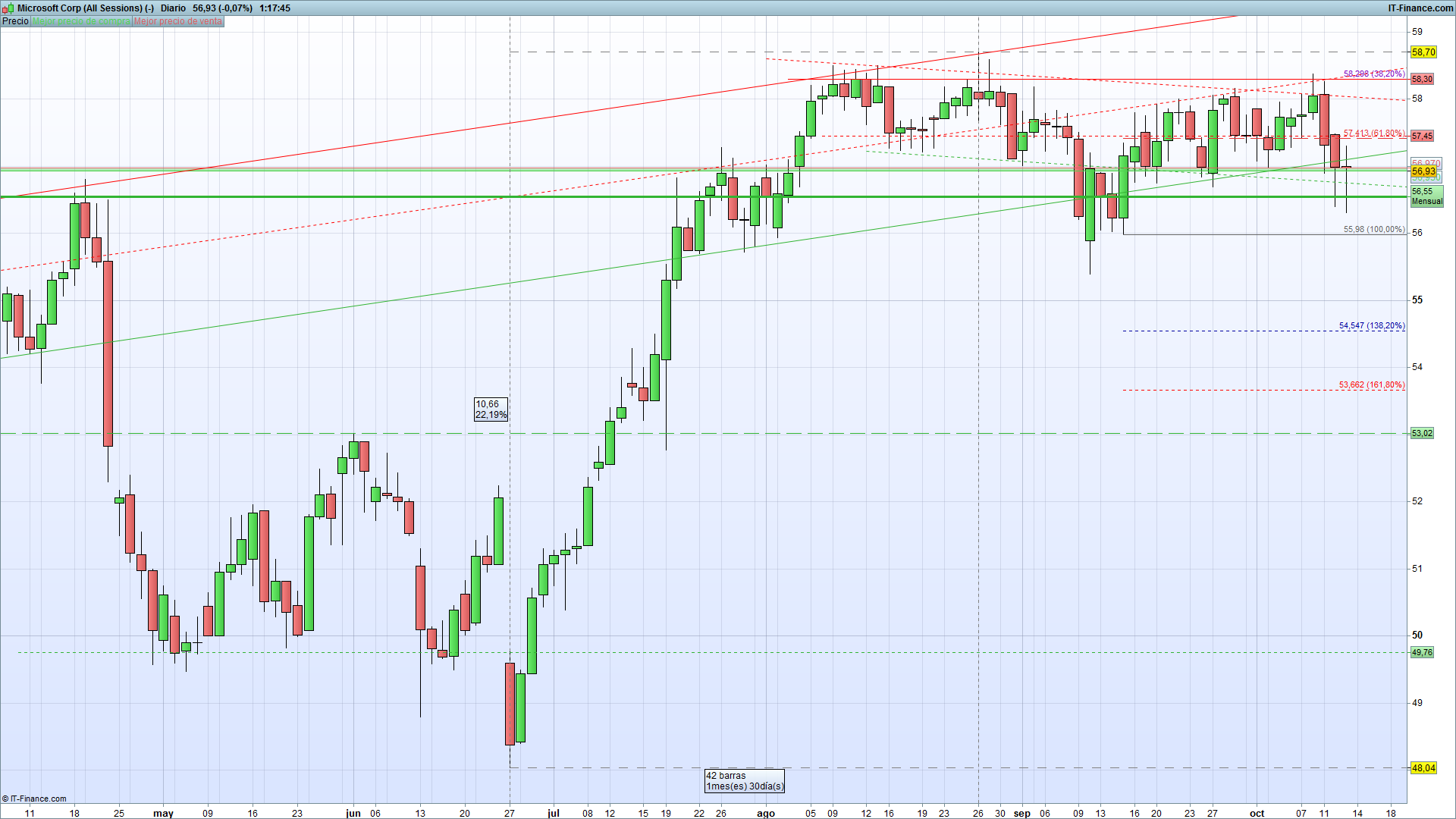 En la NASDAQ, la compañía tecnológica por referencia Microsoft Corporation, cotiza en el momento de escribir este reporte a 56.93 dólares la acción. Después del importante impulso que tuvo desde el 27 de Junio hasta el 26 de Agosto en el que sus acciones se revalorizaron un 22.19%, se sigue manteniendo en un rango de 1.75 dólares. La resistencia más inmediata la tenemos en los 58.30 mientras que el soporte lo tenemos situado en los 56.55, coincidiendo con un soporte del gráfico mensual.
