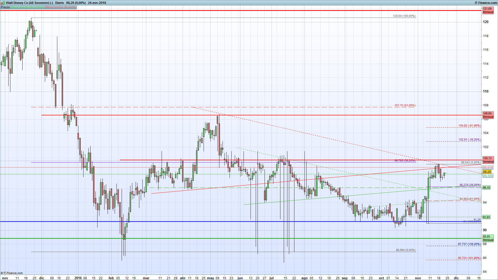 En la New York Stock Exchange, el gigante del entretenimiento The Walt Disney Company, cotiza en el momento de escribir este reporte a 99.26 dólares la acción. Desde el máximo alcanzado en el 4 de agosto del 2015, la compañía se ha devaluado casi un 20%, algo de lo que Walter Elias no estaría muy orgulloso, sin embargo, bien es cierto que ha llovido mucho y las nuevas tecnologías nos han obligado a adaptarnos a los nuevos tiempos. La caída iniciada el 23 de noviembre del 2015 hasta el 9 de febrero de este año, ha marcado unos niveles relevantes donde el precio ha tenido una reacción muy importante, puesto que cada vez que el precio ha llegado a estos niveles trazados por Fibonacci, se ha podido apreciar una reacción en el precio que ha marcado nuevas tendencias.