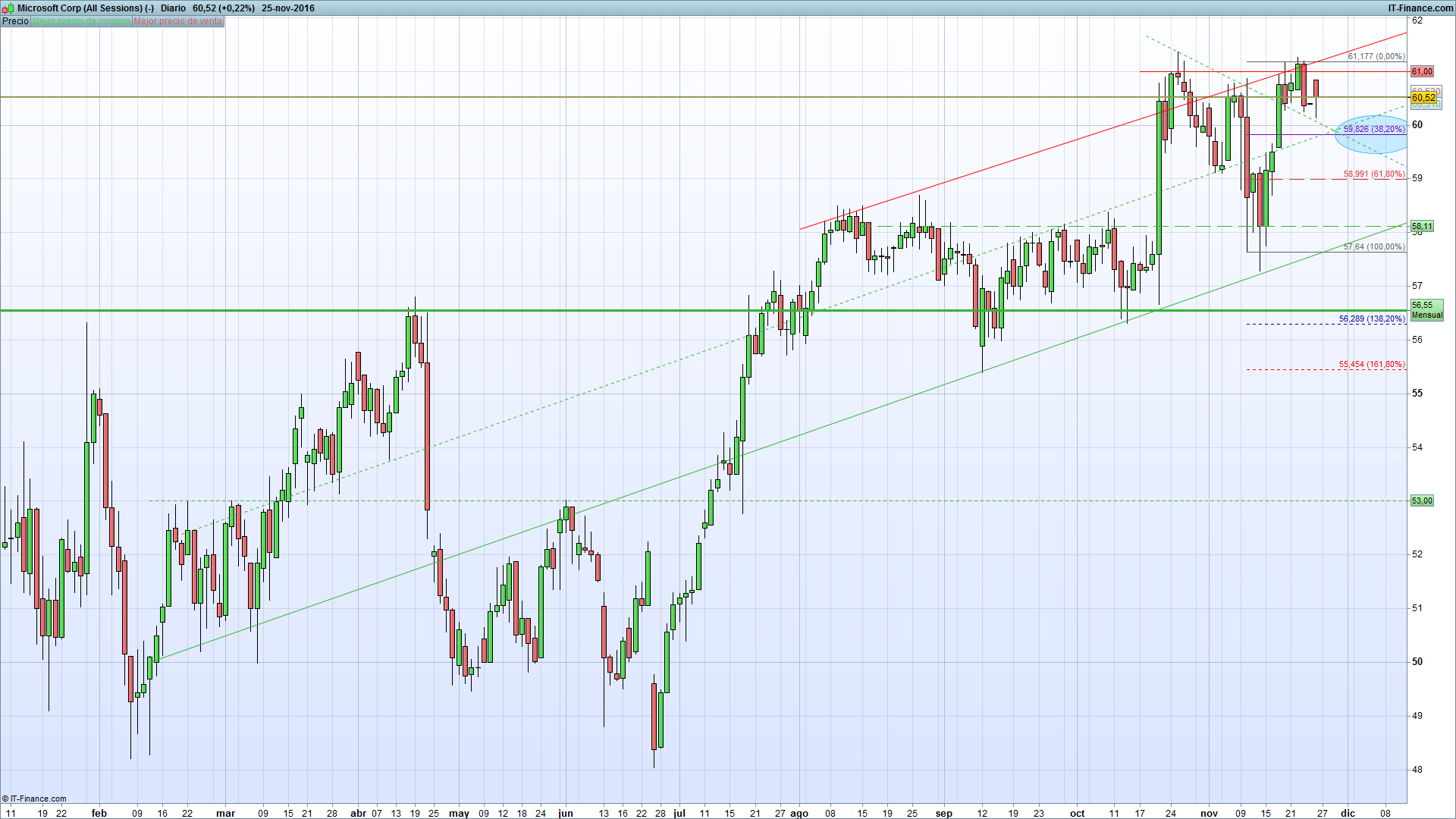 En la NASDAQ, la compañía tecnológica por referencia Microsoft Corporation, cotiza en el momento de escribir este reporte a 60.52 dólares la acción. Para los amantes de las figuras chartistas, esto podría representar una oportunidad de trading. Bien es cierto que los dobles techos, las cuñas, los canales, triángulos contractos o expansivos… nos ofrecen una visión clara de la dirección más probable del precio. Sin embargo, y como en todo, hay detractores que optan por otro estilo de trading, del mismo modo que un gran número de traders delega el resultado de su cuenta de trading en las señales de unos determinados indicadores, que bajo ningún modo, voy a entrar en criticar un estilo u otro de trading, a mi juicio, todos son válidos siempre y cuando el trader se sienta a gusto con su estrategia y esta obviamente le aporte un beneficio de forma consistente.