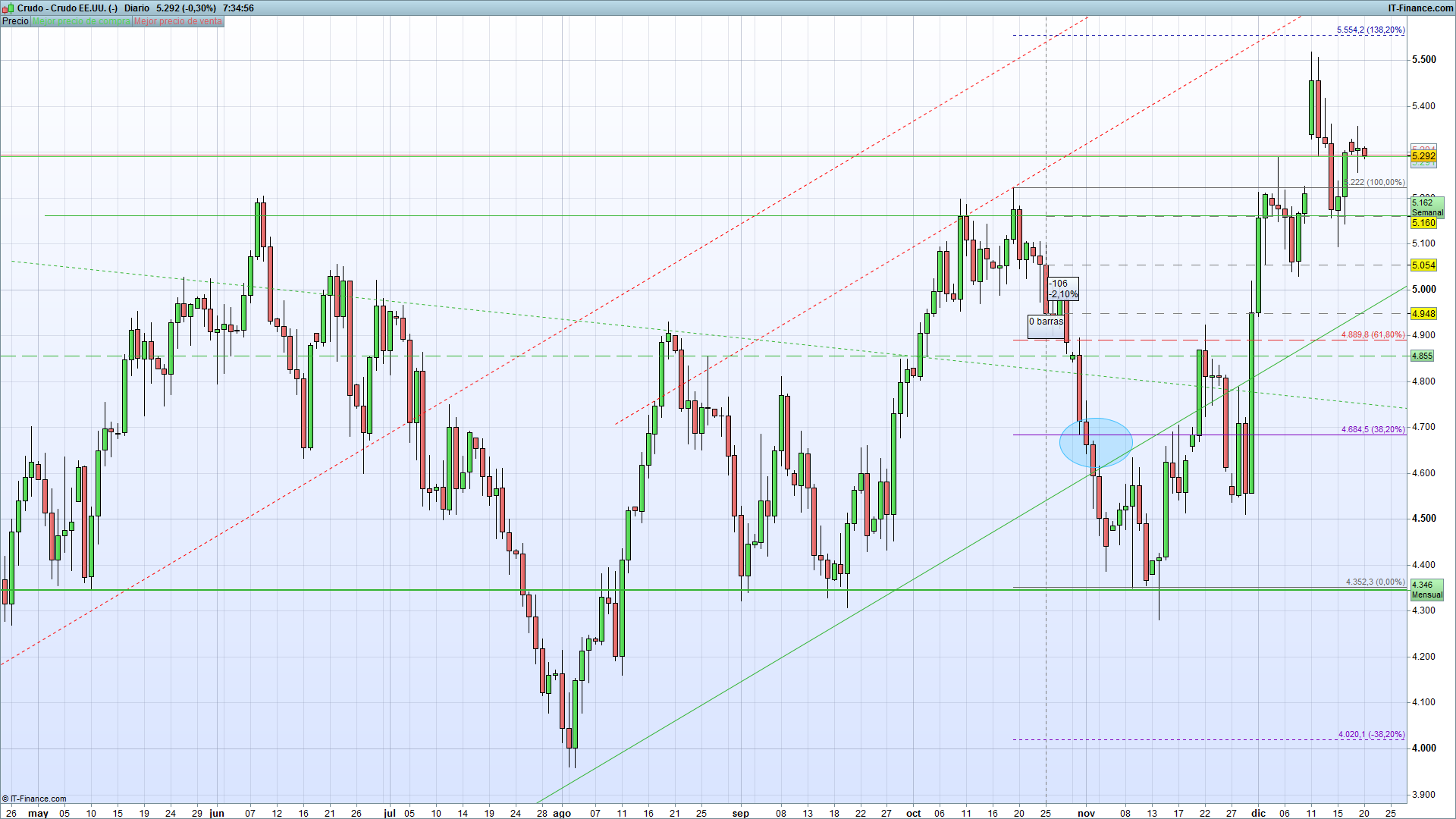 En la New York Mercantile Exchange, el futuro del Petróleo de referencia West Texas Intermediate (CL) con fecha de entrega para enero, cotiza en el momento de escribir este reporte a 52.91 dólares el barril. Poco después de romper una importante resistencia correspondiente al gráfico semanal situada en los 51.62, el precio parece estar dispuesto a continuar su clara condición alcista, principalmente porque esta resistencia ha pasado a ser soporte, lo que nos hace prever que el precio respetará este nivel y seguirá su curso ascendente.