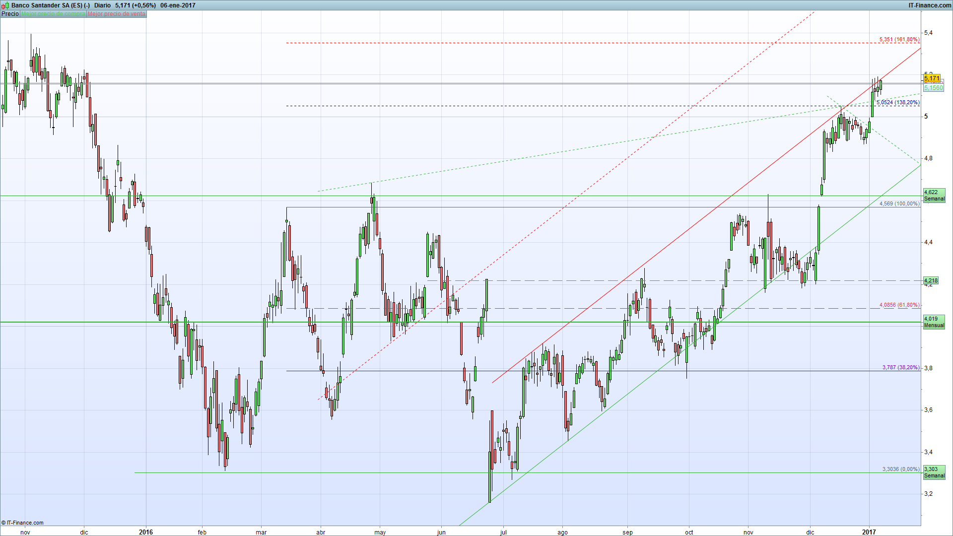 En la Bolsa de Madrid, el Banco Santander cotiza en el momento de escribir este reporte a 5.171 euros la acción. Parece ser que el endeudamiento de la entidad, curiosamente está dando su fruto, el precio continúa su rally alcista teniendo como principal resistencia los 5,370, nivel perteneciente el gráfico diario y semanal. El último impulso iniciado el 5 de diciembre, permitió revalorizar las acciones de la entidad un 17.52%, pero ese impulso no ha cedido a día de hoy, por lo que sigue sumando un total de poco más de un 23%. Todo apunta a que el rally alcista no ha concluido.