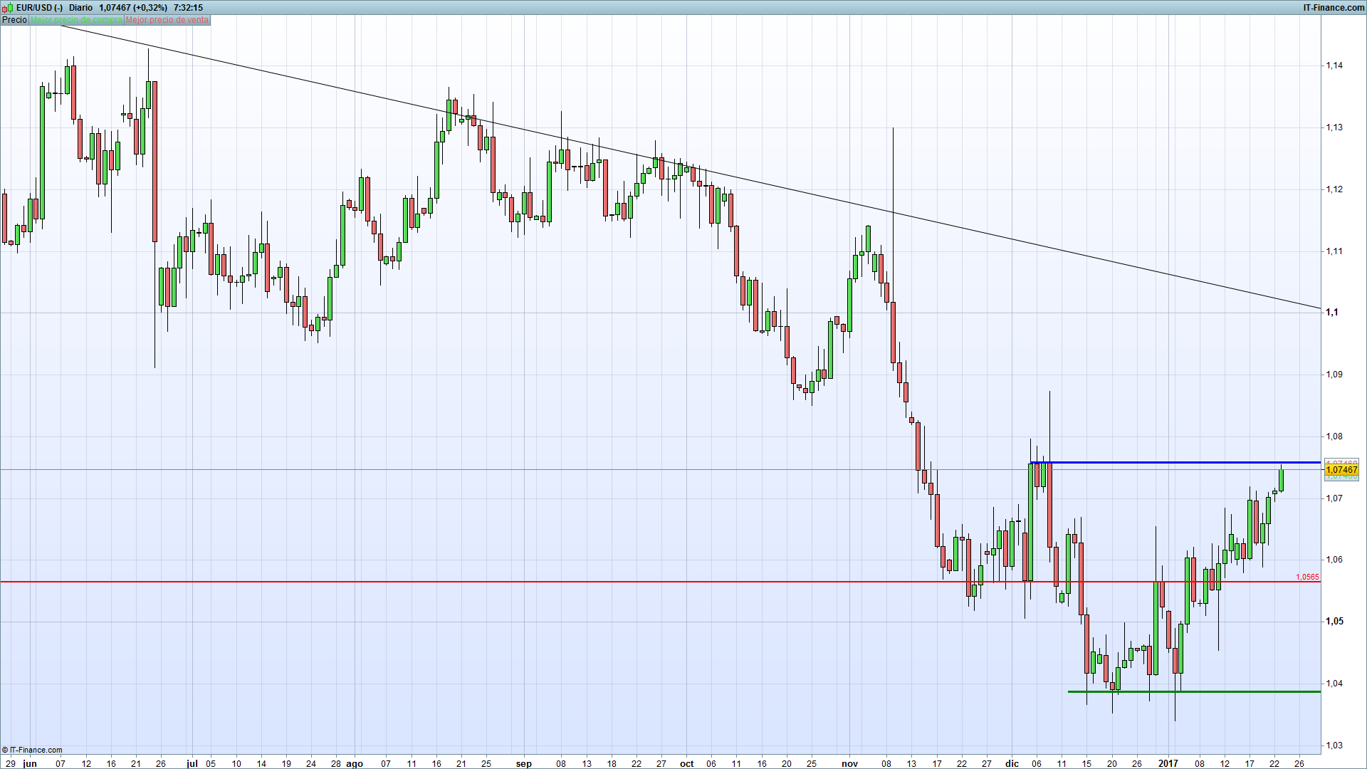 En la New York Mercantile Exchange, el futuro del EUR/USD con fecha de entrega para Marzo, cotiza en el momento de escribir este reporte a 1.0745 el intercambio de divisa. Finalmente, Donald Trump, ya es oficialmente presidente de los estados unidos de américa, y parece ser que el ciudadano estadounidense, está empachado de Trump y ya no es tanta la confianza que le tenían, por lo menos así lo reflejan los gráficos. Un dólar que se debilita poco a poco y el cual se encuentra en una resistencia del largo plazo situada en los 1.0758. Desde el mínimo alcanzado el día 3 de enero, el precio ha tenido un impulso de un 3.90%. También es cierto que este impulso ha sido regular y muy progresivo, lo que significa que probablemente el precio sea rechazado de la resistencia.