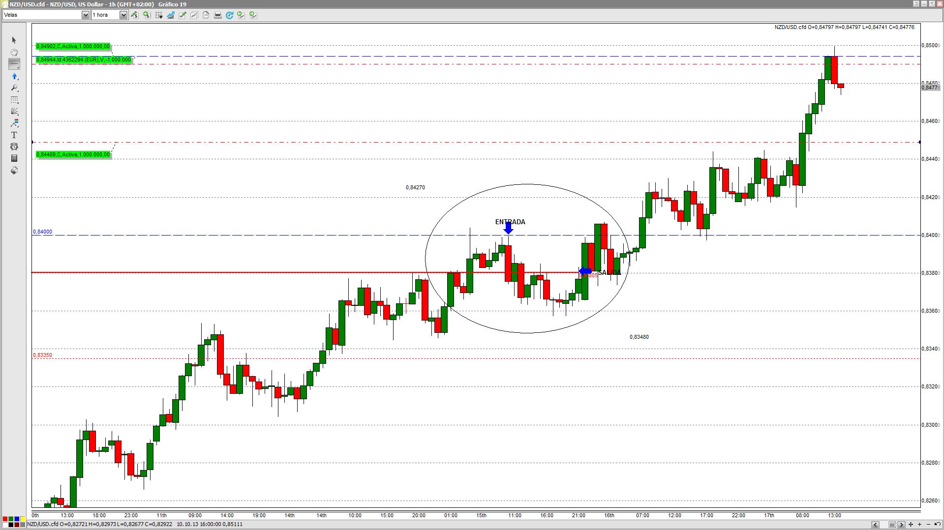Justo al día siguiente de publicar nuestra señal de entrada en RANKIA, el NZD/USD tocó el precio 0,8400. Nuestra entrada no fué la primera vez que tocó el precio por motivos de descanso (estaba durmiendo, eran las 5 de la mañana), pero tras abrir pantallas y ver que volvía a aproximarse a nuestro precio, hicimos la entrada con el acompañamiento de nuestros amigos los STOPS.