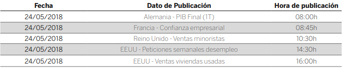 Los malos datos macro y la tensión en el mercado de deuda lastraron a los principales mercados europeos llevando a los principales índices a registrar caídas superiores al 1% en la jornada de ayer. La tensión política se vió aumentada con la confirmación del nuevo gobierno de Italia que volvío a incremetar las primas de riesgo y llevó al euro a niveles c.1,17 acumulando una caída del 0,71%. Por su parte en Wall Street los mercados superaron los descensos inciales y los principales índices cerraron en positivo tras la publicación de las actas de FED, que invirtió la tendencia del mercado.