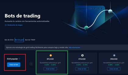 Fíjate que también tienen otros bot de rejilla (grind) preestablecidos, como son los BTC/USD (cuadro verde), o ETH/USD. Si prefieres no desarrollar tu propia estrategia, puedes seleccionarlos sin más.