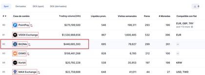 Bit2Me se ha consolidado como uno de los 100 mayores exchanges del mundo | Fuente: CoinMarketCap