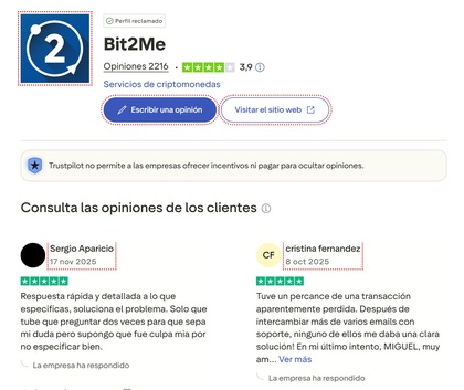 Las opiniones de los usuarios son importantes, especialmente para un exchange. Activo desde 2014, Bit2Me ha reunido opiniones de todo tipo. Por ejemplo, podemos apreciar como en Google Play Store con más de 8.500 reseñas cuenta con una nota media de 4,3 estrellas (sobre 5) y más de 500.000 descargas. Lo que no es una mala nota, y más teniendo en cuenta, que el soporte principal de la empresa es su App móvil, desde la cual podrás gestionar todos tus programas.