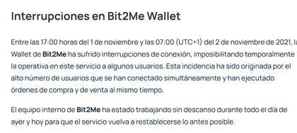 Pese a ello, Bit2Me trató de calmar a los afectados desde el primer momento, publicó comunicados explicativos y aseguró que estaban trabajando para resolver la situación lo más pronto posible