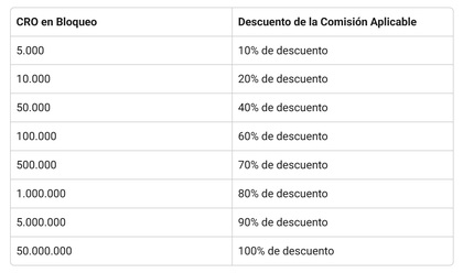 Descuentos aplicados sobre las comisiones de Crypto.com según el volumen de CRO bloqueado