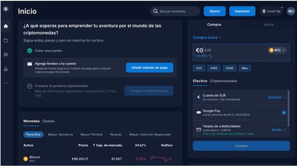 Compraventa de criptomonedas, cestas de criptomonedas, Earn & Stake, etc.