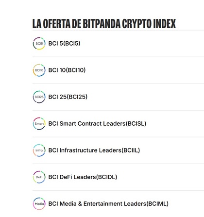 No solo cuenta con una oferta de +50 programas de staking -que no está nada mal-, sino que además ofrece más de 10 criptoíndices, una suerte de carteras preconfiguradas o "cestas" de que permiten diversificar tu inversión en varias criptomonedas desde una única aportación monetaria Alguno de los cripto índices en los que puedes invertir desde Bitpanda