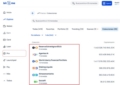 Ejemplos de cestas o "colecciones" de criptomonedas en el exchange de Bit2Me