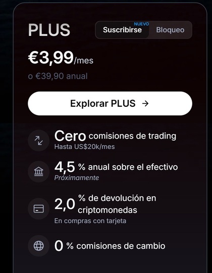 Por el lado de las recompensas por staking, a largo plazo seguramente el programa de Crypto.com sea ligeramente superior, sobre todo una vez desbloqueas la suscripción PLUS (3,99€/mes) que te permite hacer trading sin comisiones, y obtener mejores recompensas por earning.