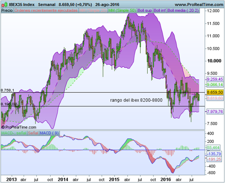 Para la semana, pensamos en una repetición de semanas anteriores donde la baja participación hace que no haya grandes movimientos y aquellos que se exageran convergen a lo largo de la misma. Pensamos ya en como posicionarnos para el difícil mes de septiembre que viene y aprovechar estos días apara ajustar riesgos y reducirlos pues al menos la primera quincena seguramente veamos tomas de beneficios y cambios de cartera importantes, más realistas a los precios actuales. Es el mismo escenario que el de la semana pasada, nada ha cambiado, tal vez solo nos sirva para tener claro los niveles. En el Ibex por ejemplo podríamos ver el rango 8200-8800 como el más probable para los próximos días. Necesitamos un catalizador para romperlo.