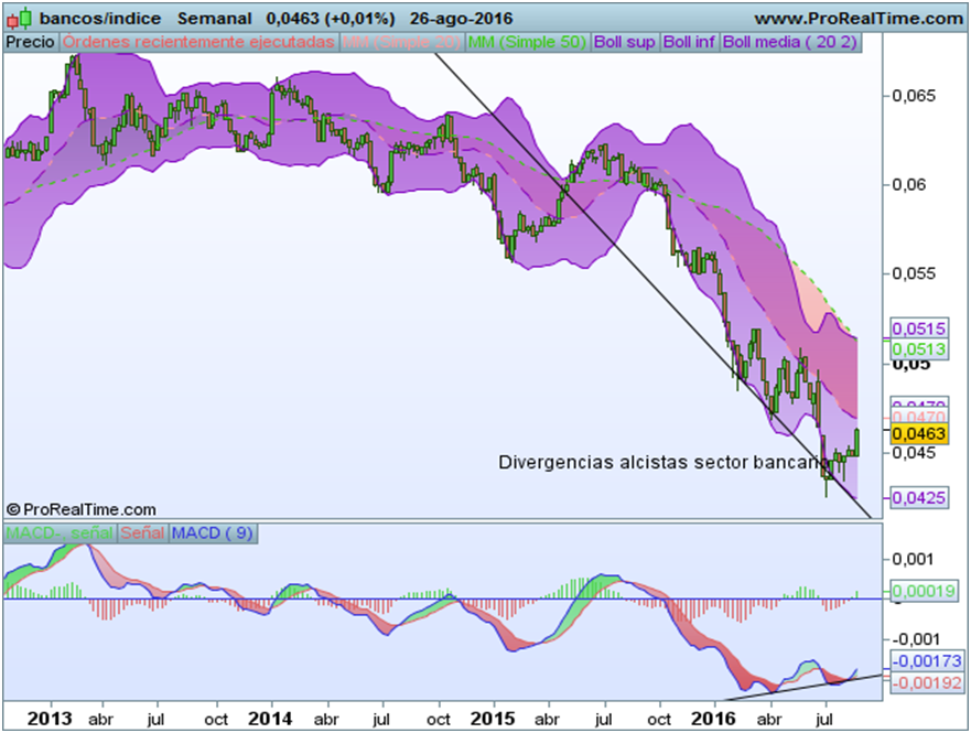 Esta semana adjuntamos gráficos del Ibex 35, sector bancario europeo relativo y divisas como adelanto de futuros movimientos. También destacamos el relativo Ibex/dax a favor del selectivo nacional aunque debe aclararse algo más la situación política nacional.
