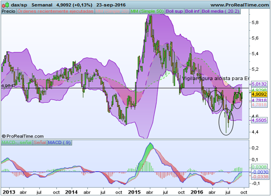 Esta semana adjuntamos gráficos del SP500, del relativo Europa/Estados Unidos, del Dax para buscar referencias tácticas y divisas como activo adelantado. Nos ha sorprendido la recuperación de los bonos tras las caídas que daban pie a pensar en un movimiento más serio, pero de momento no se ha confirmado y debemos esperar otra oportunidad, aunque insistimos en el riesgo actual de este activo.