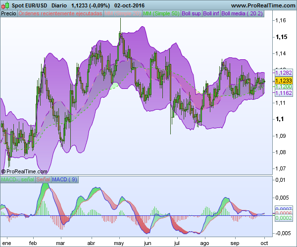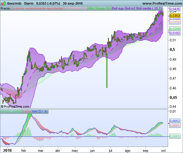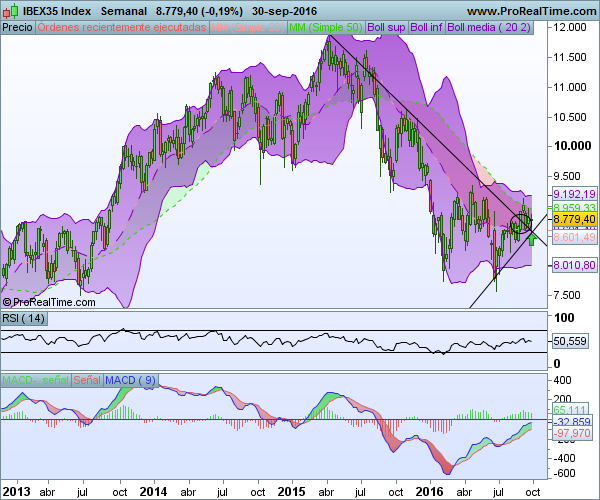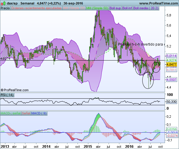 Esta semana adjuntamos gráficos semanales de diferentes índices europeos y del relativo dax/sp500 junto a la cotización de Deutsche Bank, son posibles martillos que nos dan una cierta esperanza y por eso pensamos que el verdadero movimiento del mes comenzara mas a mediados que en los próximos días. Introducimos la divisa, observando que sus bandas se van estrechando a la espera de un gran movimiento.