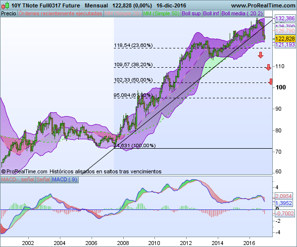 En el siguiente grafico observamos la tendencia del bono americano cuya espiral puede hacer apreciarse el usd de manera importante.