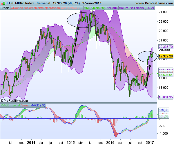 Esta semana adjuntamos gráficos diarios del mib40, dax, mib/España como relativo junto al eur/usd y el bono americano como activos lideres en el momento actual.