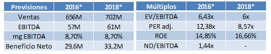 Ajustando los datos proporcionados por la empresa a nuestro método de valoración, y considerando un múltiplo prudente de 13 veces beneficios, el valor de la acción se sitúa en los 12,45€ para finales de 2018, lo que supone un potencial de revalorización del 38% en dos años desde el precio actual.