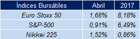 De nuevo, abril ha sido un mes fructífero para la mayoría de bolsas, a continuación se muestran las rentabilidades de algunos de los principales índices bursátiles: