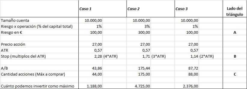 Por último, en el caso 3 disminuye un poco el riesgo y se ajusta más el stop. Este es evidentemente un ejemplo muy básico, aunque sirve para comprender el concepto, comenzar para jugar un poco con los números y calcular correctamente el tamaño de las posiciones de nuestra cartera.