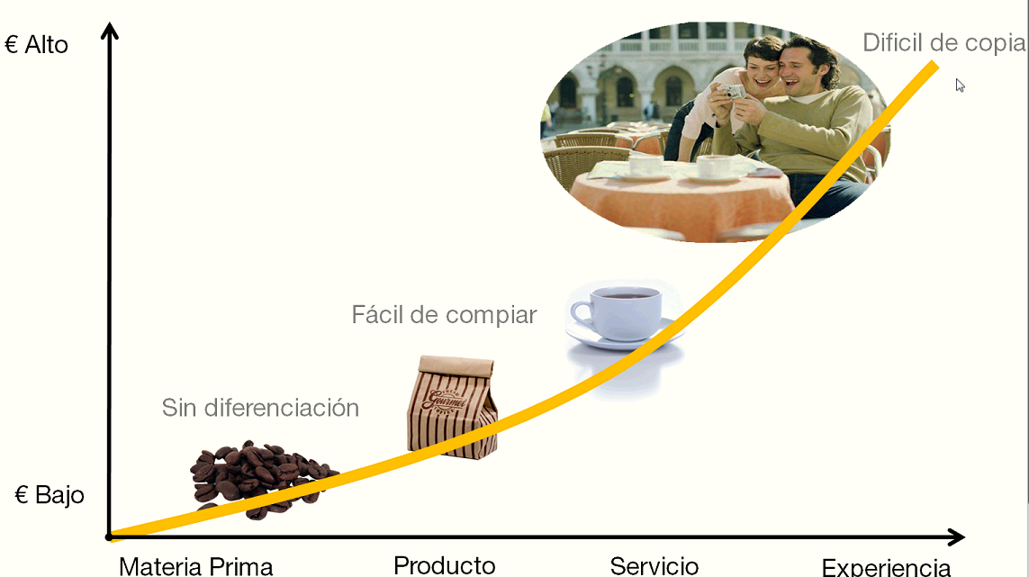 Supongamos el mercado del café. El café en grano es el producto básico con un precio bajo. Si empaquetamos el café y lo vendemos en una bolsa bonita mejora el producto y podremos venderlo a un precio más alto. Si además lo molemos y lo servimos en una cafetería ya tenemos algo distinto a lo que tenemos en los granos de café. Pero hay que dar un paso más, hay que convertirlo en una experiencia. Tomarte la taza de café en Venecia, mientras unos violinistas tocan se convierte en algo único. El precio aumenta y la sensación que tiene el cliente es muy positiva además de que los clientes buscaran volver para vivir esta experiencia.