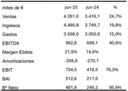 El EBITDA se situó en 983.000 euros, creciendo un 40,6% respecto a los 699.000 euros del primer semestre de 2024. Por su parte, el margen EBITDA aumentó del 18,6% al 21,9%. El beneficio neto se incrementó un 95,6%. Los gastos se incrementaron un 15% respecto a junio de 2024. Las amortizaciones se redujeron casi un 23% respecto a los primeros seis meses del año anterior.