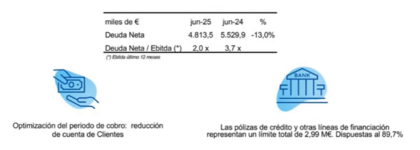 El ratio deuda neta/EBITDA mejora hasta las 2 veces desde las 3,7 veces del ejercicio anterior. Se ha reducido de forma significativa el periodo medio de cobro gracias a diversos procesos digitalizados y a un equipo dedicado exclusivamente a facturación y cobro.