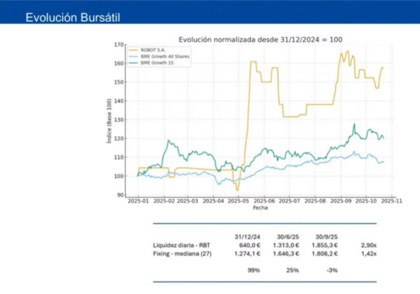 La evolución de Robot en bolsa empieza a reflejar el impulso operativo de los últimos trimestres. La acción muestra una revalorización destacada y una mejora clara en la liquidez, señal de mayor interés por parte del mercado. Todo ello se combina con una estrategia más activa de comunicación y creación de valor para el accionista.