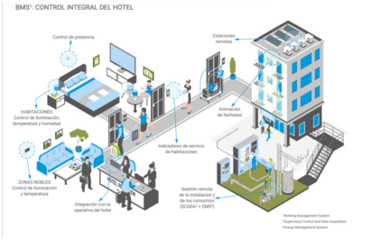El Sistema Centralizado Robot: Ahorro Energético, Sostenibilidad y Confort. En la siguiente imagen se puede apreciar cómo un sistema centralizado de gestión del edificio conecta y controla todos los servicios clave de un hotel desde un mismo punto. Es como si el hotel tuviera un cerebro digital que lo coordina todo. En las habitaciones, por ejemplo, el sistema regula la luz, la temperatura y la humedad.