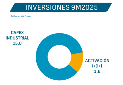 Mantiene su compromiso con la inversión industrial que asciende a 15 millones de euros en los nueve primeros meses del año. El capital circulante aumentó por el mayor nivel de inventarios y créditos comerciales. A 30 de septiembre de 2025, estas partidas sumaron 131 M€, lo que equivale aproximadamente al 54 % de las ventas acumuladas y a unos 150 días de ventas estimados.
