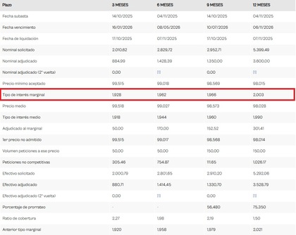 En 2025, el tipo de interés marginal de las letras del tesoro va desde el 1,93 % al 2 %