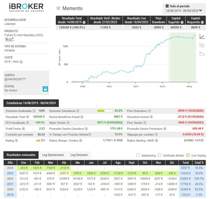 Vamos a explicar, a modo de ejemplo, y sin que pueda interpretarse como una recomendación de inversión, un SAT de los que ofrece iBroker, que se llama Memento, y está configurado para operar intradia sobre el Futuro E-mini Nasdaq de CME. Las estadísticas que se facilitan sobre este sistema son todas las que podéis ver abajo: