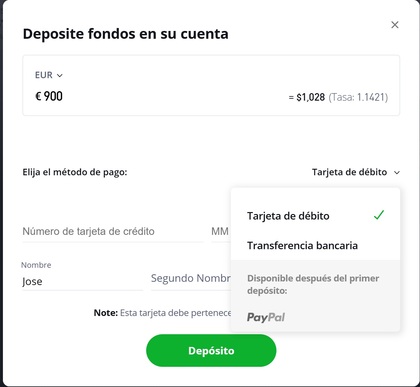 Paypal: solodisponible tras realizar el primer ingreso mínimo.