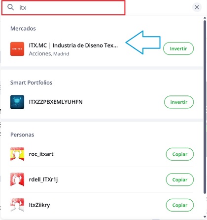 Paso 2: Buscar acciones de la compañía Inditex en eToro