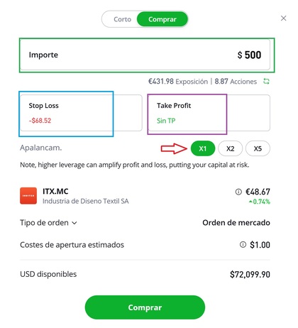 Apalancamiento: No deseo utilizar apalancamiento para evitar comisiones nocturnas y otros cargos, así que lo mantendré en "x1". De esta forma, estaré comprando acciones reales, y no derivados.