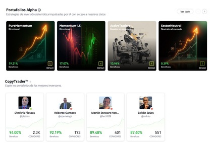 Además, para los inversores con menor práctica, ofrece la posibilidad de ni siquiera tener que pensar en que activos invertir, gracias tanto a sus smart portfolio (diferentes tipos de carteras ya creadas, y orientadas a cada perfil inversor), y la joya de la corona, su función CopyTrader que permite replicar el portfolio de los mejores inversores o "Popular Investors" de la plataforma.
